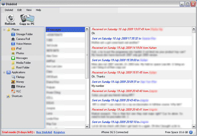 To transfer the messages to your PC, click “Copy to PC”. (Please note that only a paid copy of the software can use this feature).