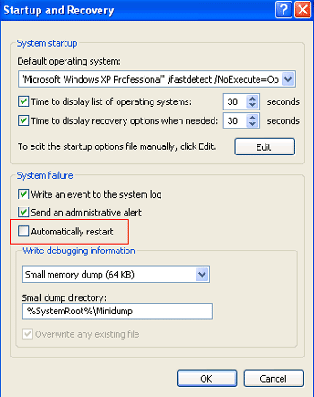 In the Startup and Recovery window uncheck the Automatically restart check box. Click Ok .