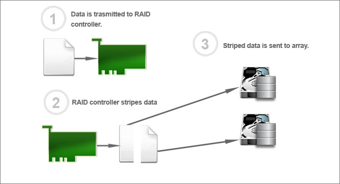 RAID 0 requires at least 2 drives. Files are striped and sent to the drives in the array. This process gives the performance enhancement of any single level RAID system as there is no redundancy.