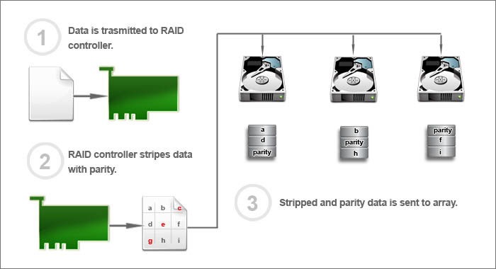 - The RAID controller will then stripe the data and then spread parity across the array.