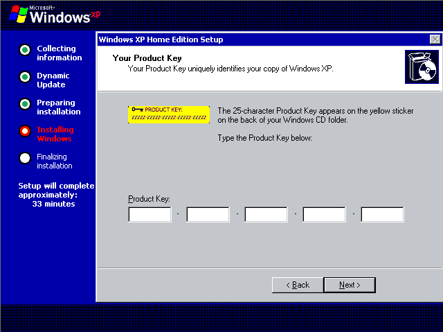 (click on thumbnail to view image) - Next, enter your Windows XP CD-Key. This key is usually attached with the CD jewel case or license. After that, click Next.