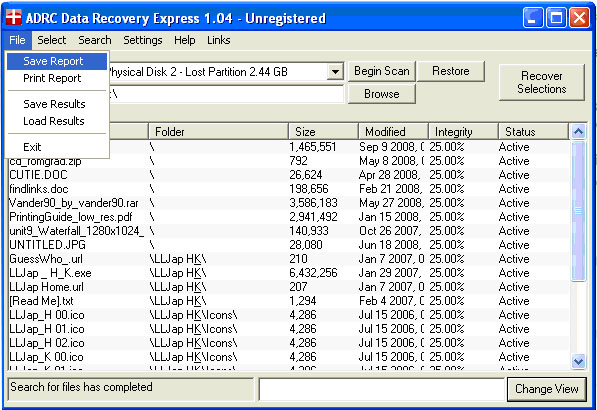 ADRC Data Recovery Express allows the user to save the "check-point" position after the scan process so there is no need to do a rescan if the current session is closed. Scanning could be a lengthy process. After the scan, you can save and then return to the same position at another session. To do that, go to File > Save Report. To resume, simply go to File > Load Results. |