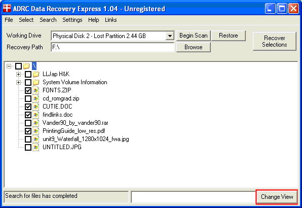 The tree view is designed to allow the user to navigate your lost files similar to Windows Explorer. Click on “Change View” to view the tree structure of the files found. It is designed to allow the user to navigate your lost files similar to Windows Explorer. |
